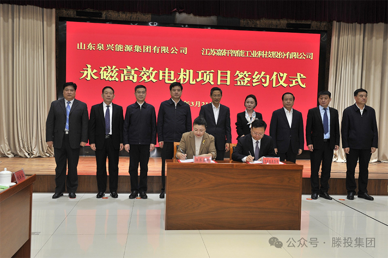 3月21日,山东泉兴能源集团有限公司、江苏嘉轩智能工业科技股份有限公司“永磁高效电机项目”签约仪式举行。枣庄市政协主席张兵,枣庄市委常委、常务副市长李守江,枣庄市委常委、滕州市委书记王广部,江苏嘉轩智能工业科技股份有限公司董事长付杰,山东泉兴能源集团有限公司党委书记、董事长张宗辉,以及我市领导刘