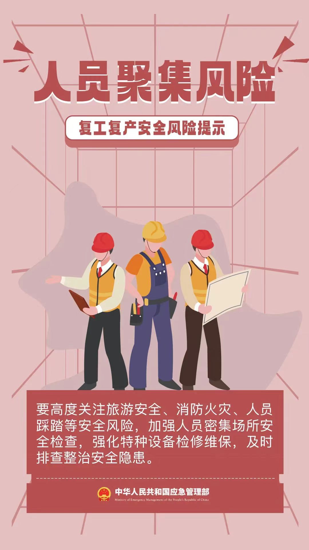 春节假期结束,各工程项目陆续开始复工复产,安全防范不可疏忽大意。下面带领大家来了解并盘点一下关于复工复产时期的主要危险因素及应对办法。复工复产时期主要危险因素:1.假期综合征受假期影响,人虽然回到工作岗位了,但思想不集中,这就是“假期综合征”。其危险之处就在于职工身心疲惫、心情烦躁、精力不集中,很容易