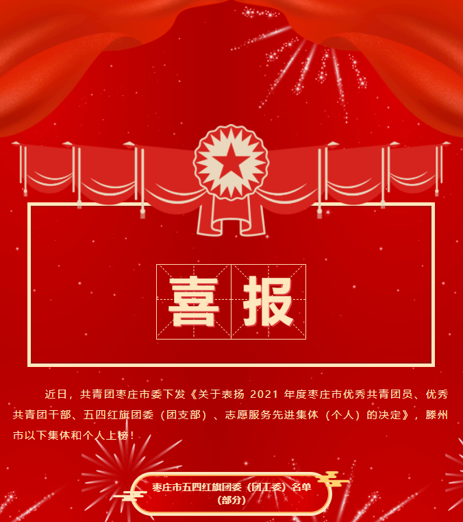 喜报 近日,共青团枣庄市委下发《关于表扬 2021 年度枣庄市优秀共青团员、优秀共青团干部、五四红旗团委(团支部)、志愿服务先进集体(个人)的决定》,滕州市以下集体和个人上榜!枣庄市五四红旗团委(团工委)名单(部分)枣庄市五四红旗团支部(团总支)名单(部分)枣庄市优秀共青团员名单(